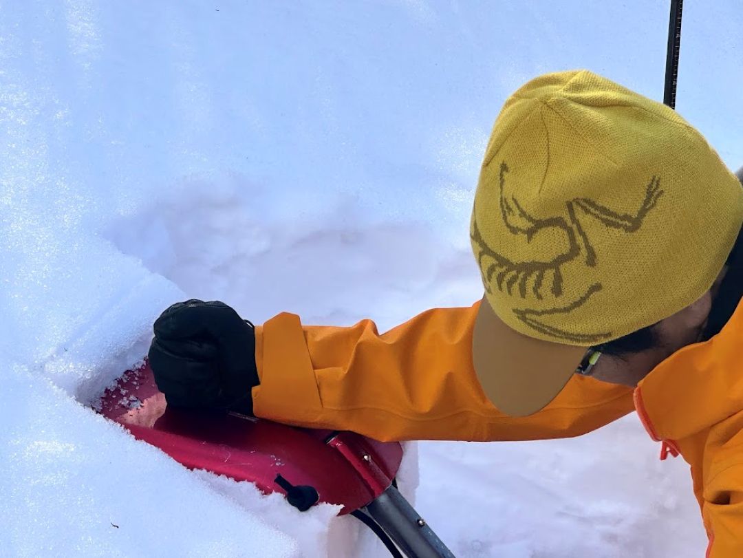 途中ではシャベルを使って積雪断面(スノーピット)を掘り、雪の内部を観察。積もった雪は一枚の塊ではなく、時間と天候によって重なった「層」でできています。結晶の形や層の境目、締まり具合を確認し、どこが弱点になり得るのかを読み取っていきました。雪は降ったあとも常に変化し続けています。積雪が薄いからといって、安全とは限らない。昨日まで安全だった場所が、今日も安全とは限らない。この前提に立ち、自分の目と感覚で判断する姿勢が、セルフレスキューにつながります。