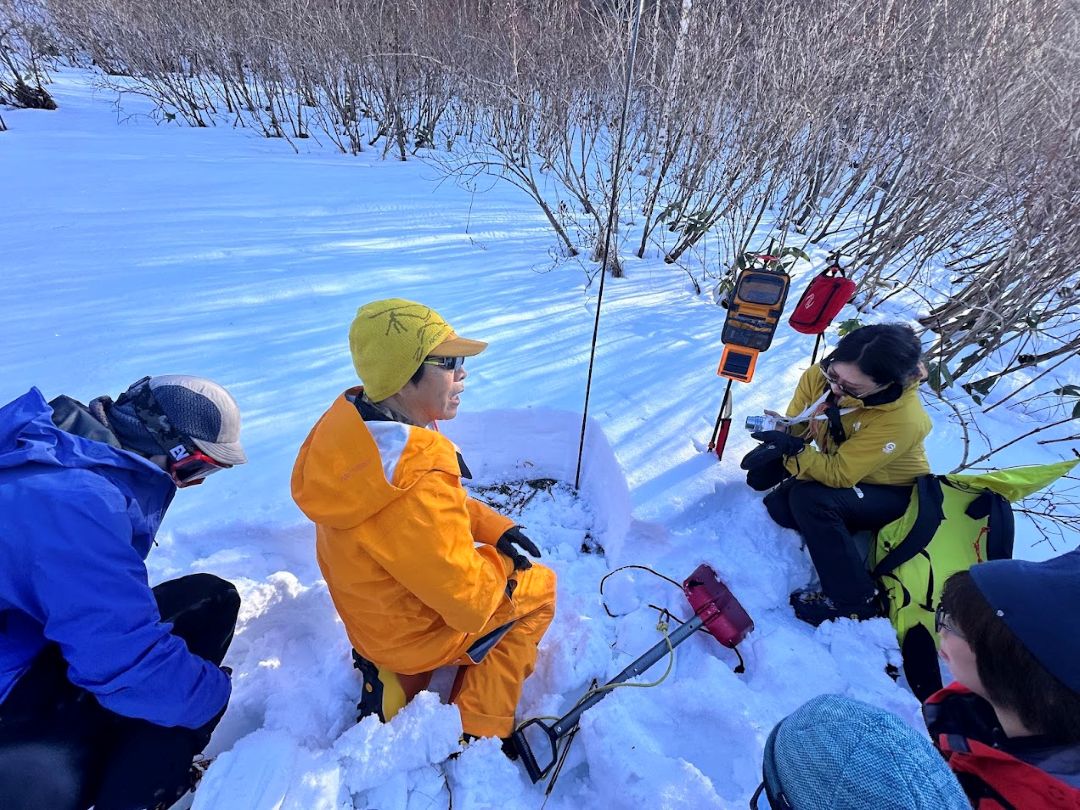 実際にビーコンを使って動いた足跡を振り返ることで、電波の出方を目で見て理解。それを知ることでより効率的にビーコンが使えるようになった参加者の皆さん。その後、プローブの使い方、雪の掘り方などを学んでいきました。最後に、遭難者チームと救助チームに分かれて実践的に練習。実際にやってみるとどう動くのが効率がいいのか、15分のうちに何をどのようにすれば生存率を上げることができるのかを繰り返し練習して身につけていきました。